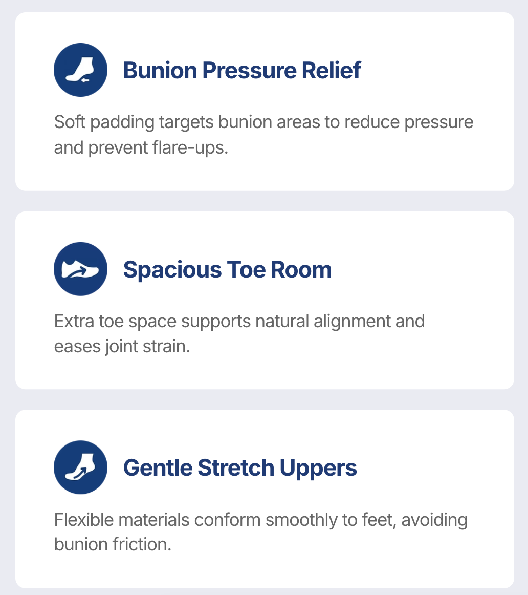 Yes, they're ideal for conditions like plantar fasciitis and bunions.The wide toe box alleviates pressure on sensitive areas, while the arch and heel cushioning help relieve pain and improve stability.